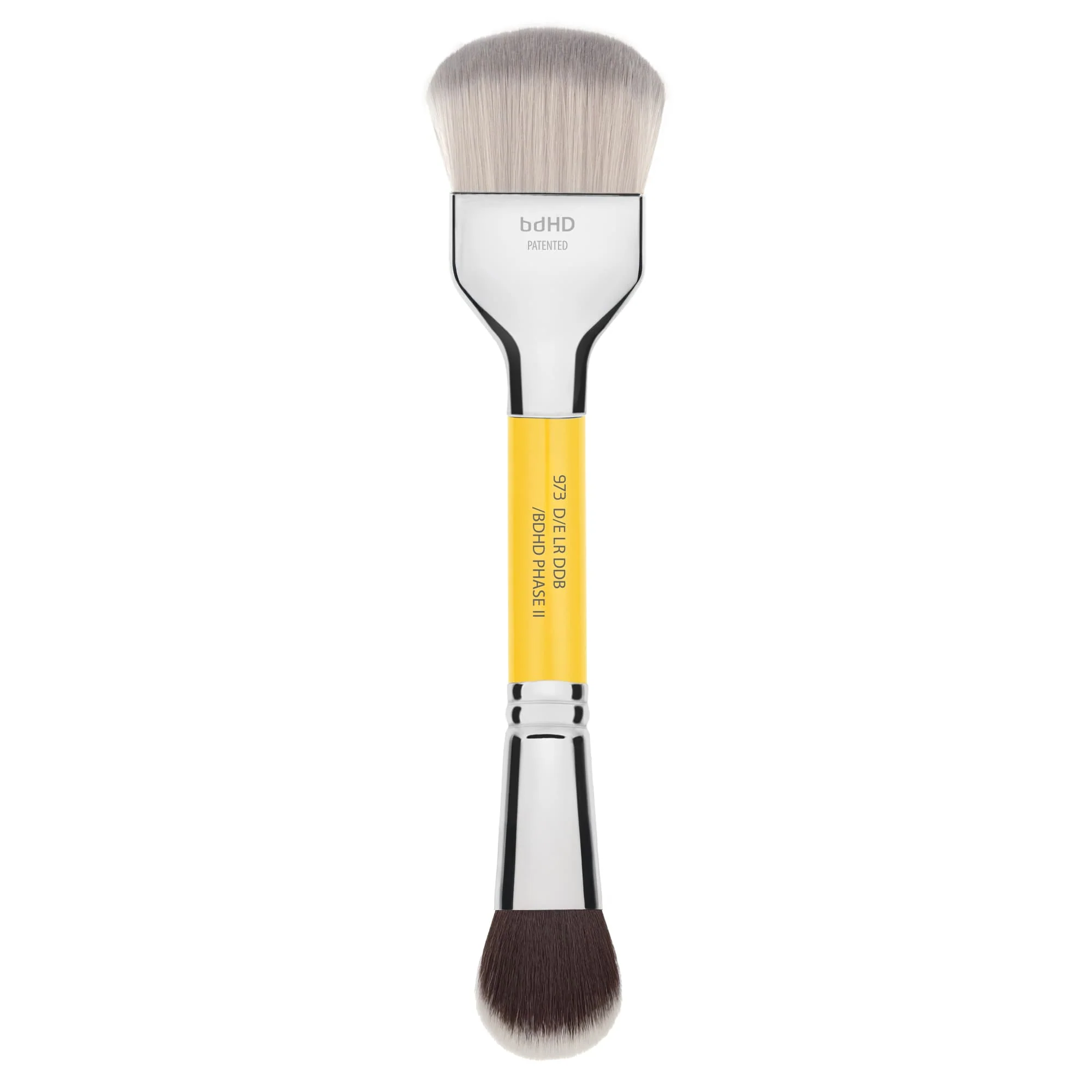 The double-ended 972/968 brush offers precise sculpting and seamless blending in one tool. The 972 end features a unique double dome design with dual bristles and an angled ferrule for targeted application and double coverage. The 968 end is ideal for applying highlight and contour on one side, then softening with powder on the other for a flawless finish.